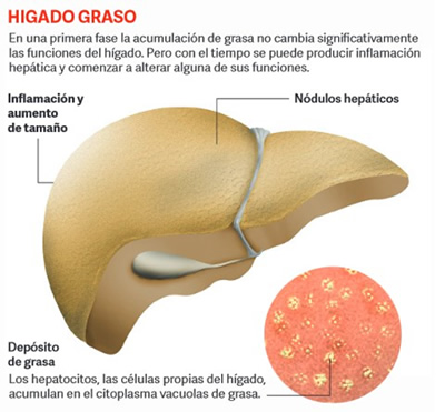 El consumo de carbohidratos, grasas, azúcares, harinas puede llevar a la elevación de los triglicéridos y al depósito de los mismos en el hígado para hacerlo graso.